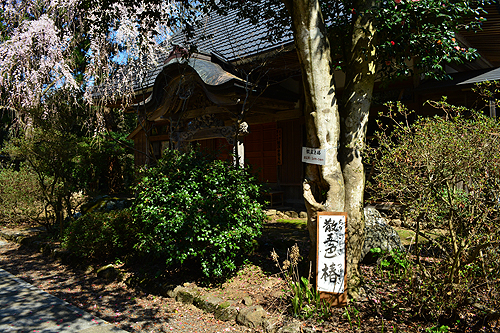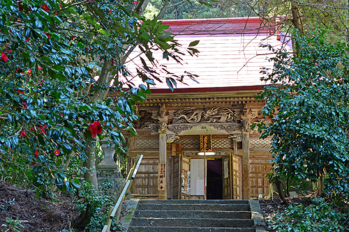 | お堂は上杉家の寄進で永禄2年(1559)の再建。(重文) | 五色の花弁が散る椿、本堂前 |