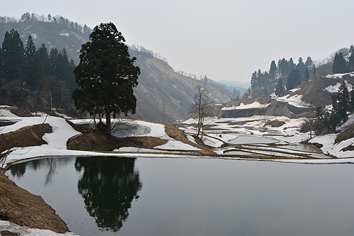 | 木喰観音堂は棚田が折り重なる山の上にあった。遊行僧の木喰が仏像を本格的に彫り始めたのは61歳からと言われており、発奮させられるものを感じる。次の魚沼へは信濃川沿いの国道に出るものと思い込んでいたら、ナビの選んだ道は山越えの県道であった。そのおかげで春まだ浅い山間の風景に出会うことができた。こんな山奥までと驚く棚田でもあった。 | |