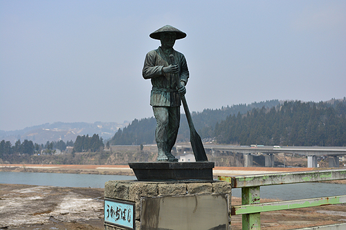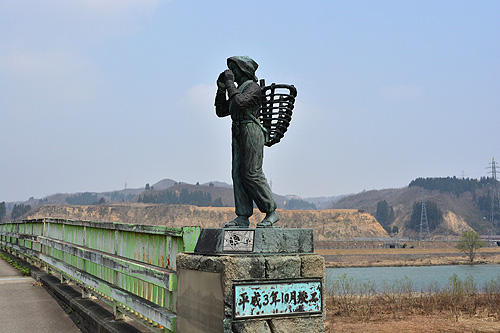 | 橋を渡り切ろうとするときに欄干の像に目が止まって車を止めた。櫓を持つ男と籠を背負う女、何だろう、、。勝手に物語を想像する。 帰って調べると、ここは魚野川の渡しのあとで、「おーい舟方さんよ」の歌で知られた所。台座のスイッチを押すと歌が流れるとか。 | |