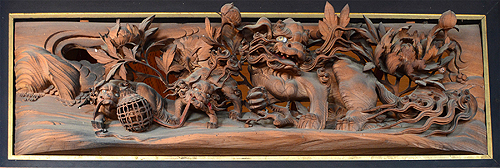 | 天昌寺 本堂 飄々と禅骨をおびたご住職が応対下さった | 欄間の枠を飛び出して躍動する3Dな彫刻 |