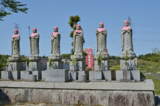 | 常久寺はお寺も立派だが、境内からの山里の眺めがとても印象に残った。次の瑞現寺まで5qを歩いて行く。途中、水かけ地蔵ならぬどろかけ地蔵さんがあった。足元の缶の中にある泥をかけてお参りする。 | ||