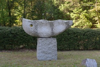 | 武並駅からJRで恵那駅に。何十年ぶりかに見る恵那峡をバスで越え、恵那峡ワンダーランド方面へ。奥戸公民館前で下車。高徳寺の方に歩いて行くと、石のオブジェが沢山置いてある。この辺りは上質の御影石の産出地で、その関係からか石にまつわるものが多いようだ。 | ||||||
