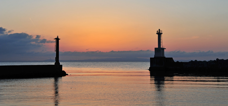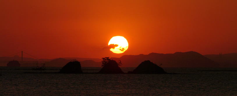 倉敷から西に下ったところに寄島の町がある。少し沖に小さな島が三つ連なっていて三郎島と呼ばれる。三郎島と瀬戸大橋を重ね、そこに昇る朝日を写そうと思った。出勤前に2回、休日に2回行ってようやくイメージに近い写真が撮れた。