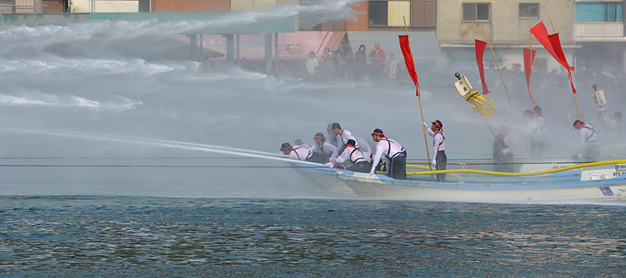所用があって岡山に出かけた帰路、日生(ひなせ)に寄って「源平放水合戦」を観た。正式には「備前市消防団日生方面隊放水訓練」というようで、消防出初め行事の〆に行われ60年の歴史があるそうだ。稚戯にも似た水かけ、本職が寒中にやると凄まじい。本気で始めた先人は偉いと思った。 (2014年2月)