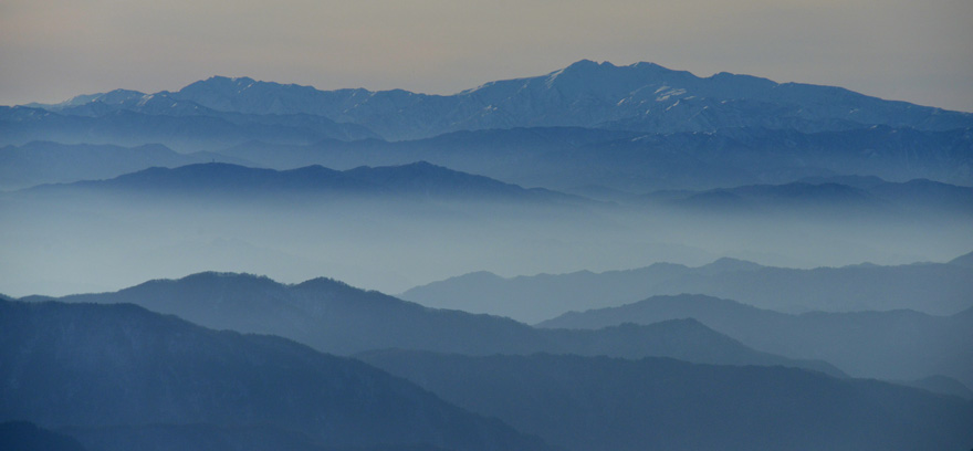 新穂高ロープウェイの『サンセット・ロープウェイ』という企画があって、夕焼けに染まる北アルプスの峰々の景観を楽しみに出かけた。山々は朱に染まらなかったが、薄雲が残る淡い夕景となった。 (2012年11月)