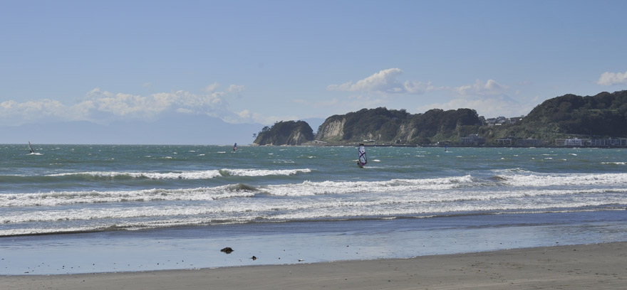 鎌倉三十三ケ所を回ったとき材木座海岸で弁当を食べた。若者が遊ぶ海を眺めながら、細かい砂が飛んでふりかかるカツ丼弁当だった。 (2012年10月)