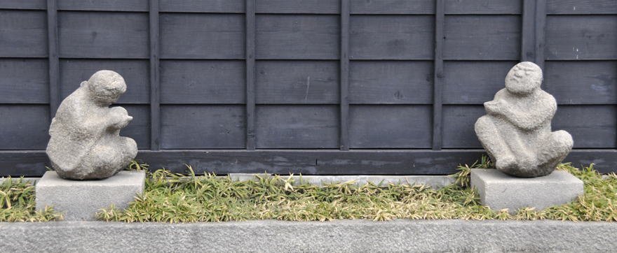飛騨古川、大好きなところ。渡辺酒造という会社の蔵の脇に、亭主と嬶の石彫像がある。 (2009年12月)