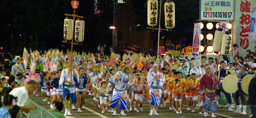 2006年8月、三度目の鳴門の阿波踊り。「お前も見ろ」と東京から息子を呼び寄せ桟敷席で合流した。写真は鳴門阿波踊りのフィナーレとなる総踊りの入場。このあと名残を惜しむ乱舞が終わって幕引きとなる。