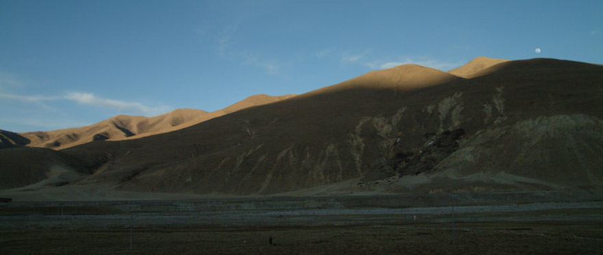 2007年の5月連休に会社関係のツアーで青海チベット鉄道に乗る。崑崙山脈の東端を越えたころの風景。 ♪月の沙漠をはるばると・・・・朧に煙る月の夜を・・・・♪
