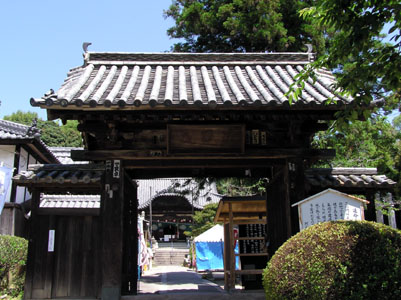 | 第五十四番 延命寺 この門はもと今治城の城門の一つで、明治になって 城を取り壊す時に譲り受けたと、右の立札に説明が ある。 |