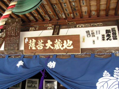 | 本堂向拝の格子天井、千社札がにぎやか。 ご本尊は 宝冠不動明王。 |