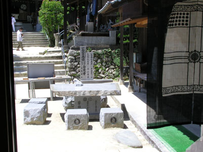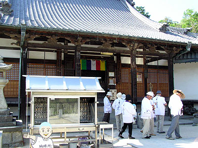 | 日差しはもう夏だ。時おり青葉の風が来て暖簾を あおる。 染め抜かれた鐘が撞かれたかのように ゆらぐ。 寺を出るときに、親子のお遍路さんと行き違う。 |