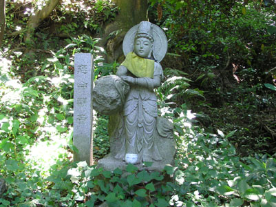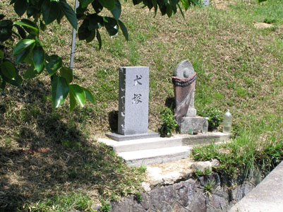 | 昔々、利口な犬がいて栄福寺と仙遊寺の使いをしてい た。栄福寺で鐘がなると、栄福寺にいって手紙をくわえ 仙遊寺に届けるというように、鐘を合図に呼ばれた寺に 飛んでいく。 ある時、二つの寺の鐘が同時になり、どちらにいくか分 からなくなった犬が、池に身を投げたという。 その犬を哀れんでの『犬塚』がある。 ここから山道を登る。 |