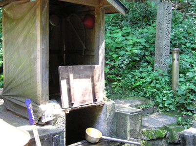 帰りも『弘法大師加持水』を柄杓で頂く。 空にしたお茶のペットボトルに入れて持ち帰る。 |