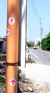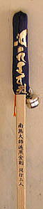 | ついでに写す。菅笠はやはり必需品、風に飛ばされる こと数知れず、車に轢かれること1回、電車に置き忘れ ること1回。梵語の「ユ」の字と「同行二人」、そして死者 を送る偈文といわれる「迷故三界城 悟故十方空 本来 無東西 何処有南北」が書かれている。 金剛杖もホテル・民宿に置き忘れること各1回、もう10 cm以上短くなってしまった。「南無大師遍照金剛 同行 二人」のお印がある。 |