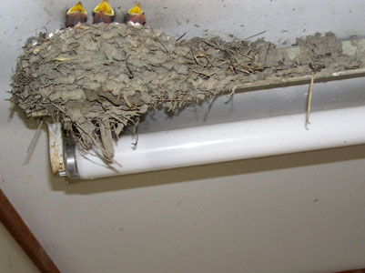 | 電車の時間が近づいたのでホームにでると、ツバメが トイレに入っていった。中に入ってみると巣があり、カメ ラをかざすと、親ツバメの影と思いヒナたちは口をあけて 啼く。 17時36分桜井発、19時37分児島着。 |