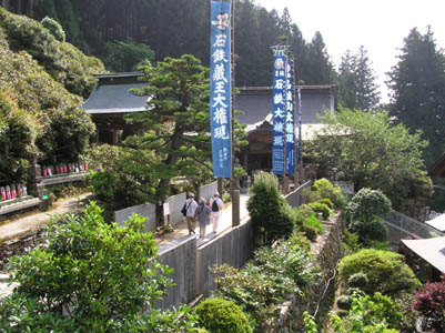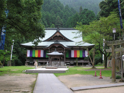 | 第六十四番 前神寺 宿から10分も歩かないうちに静かな境内に着いた。 前神寺は西日本の最高峰石鎚山(1997m)の登り 口近くにある。7月1日から10日までが『お山開き』に あたるためか五色の幕が張ってある。 |