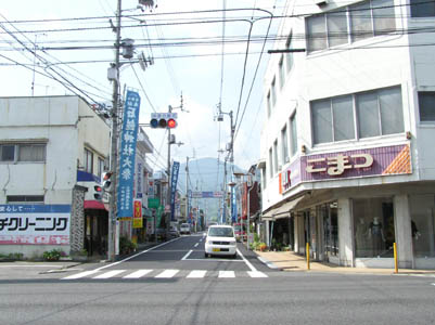| 伊予小松の街をぬける。遠くに石鎚連峰が見える。 コンビニでお昼のおにぎり三個とペットボトルの水と 凍らせたお茶を買う。 |
