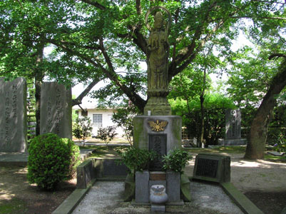 | 『顕彰慰霊塔』は太平洋戦争中に特攻隊や国土防衛 の空戦等で大空に散華した逓信省愛媛航空機乗員 養成所出身者の霊を慰めるために建てられたと碑文 にある。 観音様の御手には飛行兵が抱かれている。 |