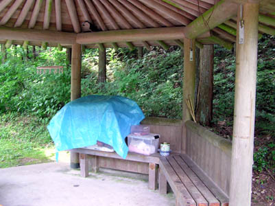 | 池を越えてしばらく行くと、61番香園寺の奥の院があり この辺りから段々と上りがきつくなる。近くに東屋を見つ け休憩。時刻は11時、もうしっかりと汗をかいた。 ここはお遍路の野宿に使われるようで、トイレットペーパ ーや毛布などが整理して置かれていた。 |