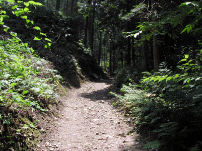| 61番から60番横峰寺までは10kmある。標高およそ 750mにある横峰寺への上り口は大谷池に沿った緩 やかな舗装路で、出だしは元気に進む。 |