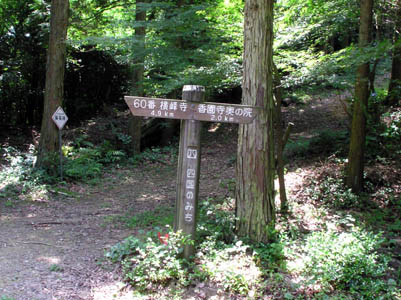 | 東屋からしばらくいくと『横峰寺』の道標があり、深い 山道に入っていく。 |