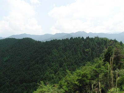 | 休憩所から暫らくは比較的平坦で、見晴らしのよい所 で写真を撮るゆとりもあった。途中で団体のお遍路さん と出会う、年配の方が多い。60番から61番への下りで の遍路道体験という。暑いのに大丈夫かなと他人を気 遣う余裕もその時はあった。 標高4〜500m付近でアップダウンを繰り返しながら 進む。 山の遍路道には『あと少し、頑張りましょう』といった励 ましの札が所々の枝に下げてある。ここでは『汗を流 し、心を洗いましょう』というような札を2,3見かける。 これだけ汗をかけば、俄か遍路の心はずいぶんきれい になったはず、、、。 残り2km付近から再び急な上り道が続く、最後の上り を頑張る。 |
