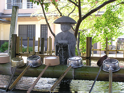 | 第八十三番 一宮寺 海辺の根香寺から一度南へ16km余り下がった所に ある。歩けば半日の距離だが車では45分で着いた。 水屋ではお大師様(?)が迎えて下さる。 たなごころより湧く水を頂く。 |