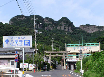 | 次の八十五番札所は屋島と並んで瀬戸内海に突き 出る五剣山にあり、やはりケーブルカーで登る。 山の名の由来は、五つの剣の先が連なったように見 えたからだが、約三百年前の地震で東(右端)の峯が 崩れ、四峰になってしまった。 |