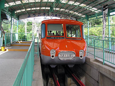 | 流線型がレトロな感じを際立たせる八栗のケーブル カー。 これで八十八ヶ所の二つのロープウェイと二つの ケーブルカーを制覇! このケーブルカーは戦時中に八栗寺の梵鐘と共に 供出され一度全て撤去されたが、昭和39年に再建 再開された。 |