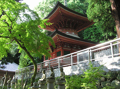 | 昭和59年建立の多宝塔。朱色が鮮やかながら 古い境内に馴染んでいる。 |