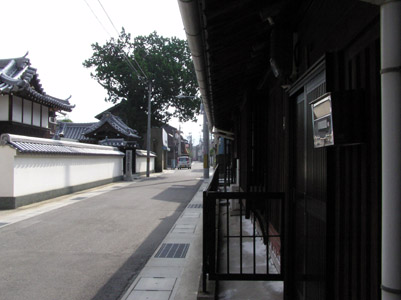 | 志度の町並 駅から八十六番札所に向かって歩いていくと、 『平賀源内先生遺品館』の案内があった。案内 の矢印に従って道を折れると、落ち着いた古い 志度の町並が続く。 |