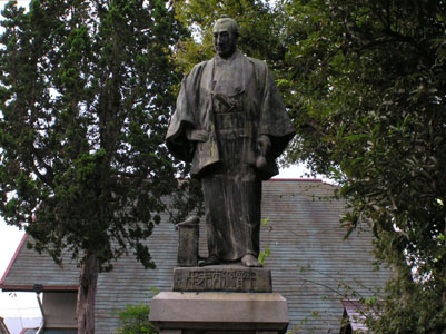 | やがて、平賀源内先生の像がたつ遺品館に到着。 資料館を見学する、旧邸跡の展示室は台風による 浸水で畳があげてあった。 |