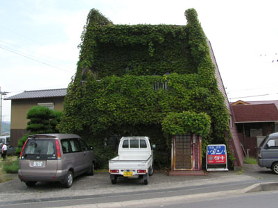 | 次のお寺に向かってとぼとぼ歩いて行くと、不思議 な物が目に入って来た。緑の小山のように見える。 その小山の前に来て喫茶店と分かった。 はじめに見えた左の壁は一面に蔦が生い茂ってい て、とても喫茶店とは思えなかった。 |