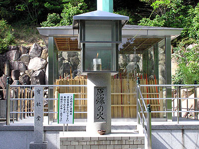 | 境内には『原爆の火』が灯されており、その奥に 『寶杖堂』があり、結願を果たしたお遍路達が奉 納した金剛杖が収められてある。年に二回焚き 上げられるとのこと。 俄か遍路も金剛杖、菅笠、輪袈裟を感謝をこめて 奉納した。 |