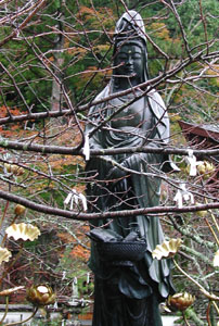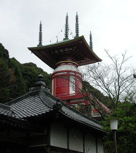 | 【上の写真】 私は観音様が好きだ。衆生救済、大慈悲の菩薩 (仏の使者)、とりわけその慈悲にあふれた優しい 姿が好きだ。不思議なことに、この観音様は蓮では なく魚を入れた籠を持っておられる。(後日調べると、 、魚籃観音、三十三観音の一つの由) この観音様は日和佐の町と海を見守っておられる。 【右の写真】 赤い建物は瑜祇塔(ゆぎとう)と呼ばれ、真言密教 独特のもので、多宝塔の原型をなすそうだ。 瑜祇塔は初めて見るが、薬王寺の瑜祇塔は日本一 の大きさを誇って見ごたえがある。 |