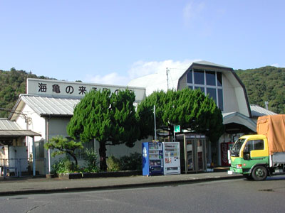 JR牟岐線日和佐駅 日和佐の大浜海岸は海亀の産卵で知られる。 阿波の霊場を打ち終え土佐に向かう。 ここから甲浦まで1時間余り電車に乗る、車中では びしょ濡れとなった靴と靴下を乾かすことに専念。 靴は日和佐のうどん屋さんで頂いた新聞紙で、何と か履けるまでに水気が取れた。靴下はあきらめた。 |