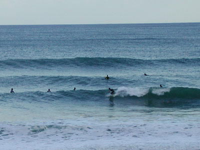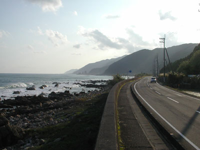 14時30分頃にバスを降りて歩行開始。30分程歩 いた所に『室戸23Km』の標識がある。 おかしい! 室戸より目指す室戸岬は2Kmほど遠い、 10Kmほど早くバスを降りすぎたようだ。 バス停も見当たらず、国道55号を海岸沿いにひた すら歩く。 (室戸岬は右の写真では一番奥に霞んで見える) |
