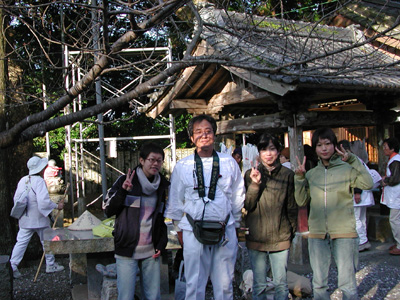 納経所も済ませ灯台を見に行こうと考えていたら、 お遍路のことを調査している高知大学の学生さんに インタビューを受ける。 Q.どちらからですか? A..倉敷から、単身赴任してます。 Q.動機は? A..酔った勢いで公言したから。 Q.お寺をまわりながら観光もしてますか? A.そんな余裕ありませんヒタスラ歩いてます。 よかったらホームページ見てください。 俄か遍路は十年に一度のことと、記念撮影をお願い した。 |