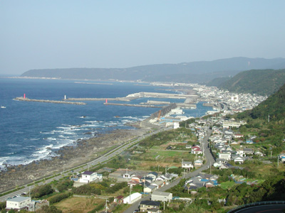 | 灯台を見るはずが反対の方に出てしまった。 足が心配なので下りは車道を通る。 漁港を囲むように室戸の街が広がる。 国道55号に出たところに喫茶店があり、朝の コーヒーを味わう。55号沿いには喫茶店が所々 にありコーヒー好きの俄か遍路は大いに助かる。 前日は缶コーヒーを4回も飲み、4缶目はさすが に気持ちが悪くなってしまった。 |