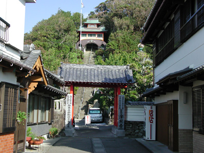 第二十五番津照寺 喫茶店から小一時間歩いて、室戸の街中の二十五番 札所に着く。石段を跨ぐように鐘撞き堂がある。御本尊 は楫取延命地蔵菩薩。 昔、藩主山内一豊を乗せた船が沖で遭難しかかった 時に、一人の僧が現れ楫(かじ)をとって船を助けて、 忽然と姿を消した。翌日お堂をのぞいて見ると、ご本尊 の地蔵菩薩は潮に濡れていたという言い伝えがある。 |
