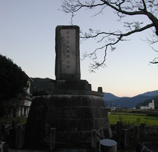 温泉の向かいの河原に『二十三士殉節之地』と刻んだ 碑がある。 幕末の土佐藩、尊王攘夷の士23名は野根山に集結、 土佐勤皇党の釈放や藩政改革を要求。しかし藩は討伐 軍を送り、二十三士は逃れるが阿波藩に捕捉され土佐 に引渡されてしまう。 二十三士は一度の吟味もなく奈半利河畔で打首に処せ られた。(温泉で頂いたパンフレットより抄出) 十代の若者も四名いたようだ、若い命が悼まれる。 |