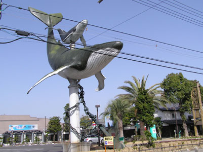 土佐市街に入る。 大きな鯨の親子のオブジェが。うどん屋さんの看板だが 見ていて楽しくなる。 |