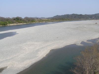 | 目指す種間寺は中央かすかな山並みのあたり。 国道56号線に架かる仁淀川大橋より。 |