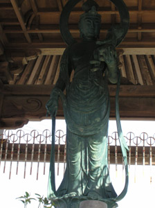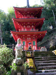 朱色も鮮やかな三重塔の前に観音様がおられる。 瀬戸内寂聴さんの本で教わった観音経の一節を あげる。 観音経は長いお経なので、時間のない人やお経が覚え られない人はその一節を唱えるだけでもよいそうな。 観音様は大慈悲の菩薩様で、ズボラでも何でも許して 下さる、ありがたい。 |