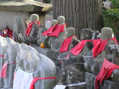 お参りを済ませ、境内の見学。 御本尊は安産に霊験あらたかな薬師如来。安産を願う 土地の人は柄杓を奉納し、寺ではその底を抜いて祈祷 を行い、それを床の間にそなえ、無事に出産をすると柄 杓を納めお礼のお参りをするという。 境内には赤子を抱いた子育観音の像。納められた 柄杓が掲げられている。 |
