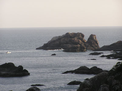 5時15分ほど前に36番青龍(ショウリュウ)寺山道入り 口に到着。車で20分程だが自分が見積もっていたより も遠い。 青龍寺には朝にお参りすることにしていたので、お礼を 述べ車を降りて宿に向かう。 この辺りの海岸は白ヶ鼻という、所々に大きな岩が波 に洗われている。といっても、陽気がよく穏やかな海。 |