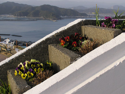 国民宿舎入り口近くの道路に車が何台もとめてある。 XX−14、XX−14とナンバープレートの下二桁が同じ 2台の車がが並んでいるのに気づく。あれ、次も”61” の車が2台続いている。アーッ!その次も”82”が2台 続いている。下2桁が同じ車が続いて3組並んでいる。 珍しいというより、不思議。確率は100万分の1かな? ようやくと宿舎の玄関に到着。パンジーが出迎えてく れる。写真では分からないが、紅いパンジーは、深紅 のベルベットのような花弁が素敵でしばし眺めていた。 |