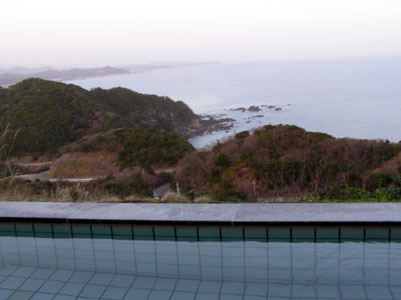 山道を登って汗だくになったので、アイスコーヒーで 休息をとって、露天風呂へ。 風呂は小さいが、眺望は大きい。 入浴しながら土佐湾の夕暮れを楽しむ。 |