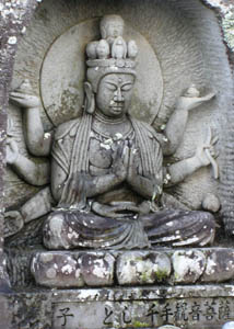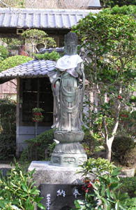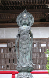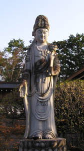 右端には千手観音菩薩。子年の守り本尊。 写真右は境内におわす聖観音菩薩。 納経を済ませ宿の前の停留所から7時48分に宿毛行 きバスに乗る。宿毛の駅では電車の時間まで30分余り 時間がありコーヒーを飲もうと食堂にいく。奥から『オーイ お遍路さん、こちらへどうぞ』と声が掛かる、見るとすっか り出来上がった年配の二人組みが気炎を上げている。 辻さんとその友人にコーヒーとビールを接待頂く。辻さん は弘法大師から観音十句、果ては水滸伝まで滔々と言 い及ばれた凄い御仁でした。 |